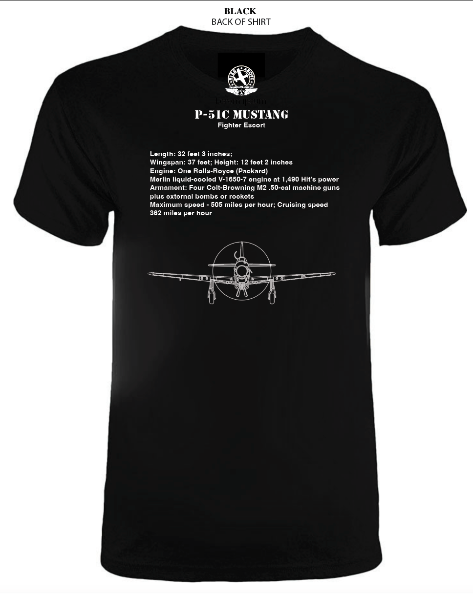 - A P51-C T-shirt. A stunning silver ink shows off the P-51C Mustang with the specifications of the plane on the back!